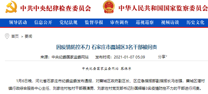 2021年1月,河北省石家庄市纪委监委发布通报,对藁城区政府副区长、区应急指挥部副指挥长冯志强,藁城区增村镇行政综合服务中心主任、刘家佐村包村干部聂潇男,刘家佐村党支部书记孙国辉等3名疫情防控不力的干部进行问责。问责情形主要包括:在组织开展疫情防控工作中,安排部署不到位,督促检查不力,落实疫情防控要求不到位,采取措施不及时。1月19日,黑龙江望奎县16名党员干部和公职人员在疫情防控工作中存在严重的形式主义、官僚主义问题,导致当地出现聚集性疫情,且隐匿传播时间长、对外扩散传播广,给全省疫情防控工作带来极大压力,被纪委监委追责问责。从问责案例看,既有领导责任、主体责任,也有主管责任、岗位责任。受处理人员有的还是主要负责人。他们本应发挥“头雁”作用,全力投入防控工作,却知纪违纪,给疫情防控带来风险隐患,造成不良影响。