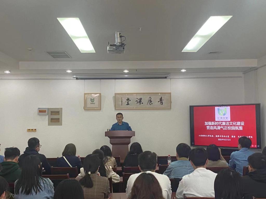 4月13日下午,山东财经大学纪委、监察专员办公室、团委、马克思主义学院在学校“青廉课堂”教育阵地联合举办“青廉课堂”。学校“青廉课堂”师资库教师,校纪委、监察专员办公室正处级纪检员刘宝璋以“坚定理想信念 培根铸魂 拒腐防变”为题讲课。